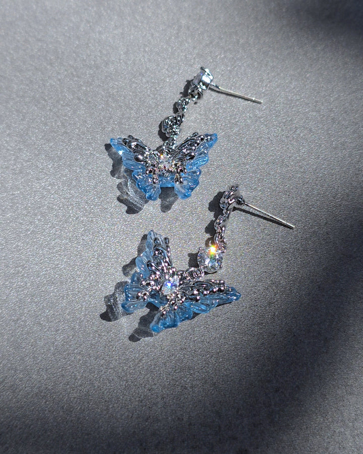 Dangling silver earrings with intricate butterfly design in transulent blue, finished with sparkling gemstones.