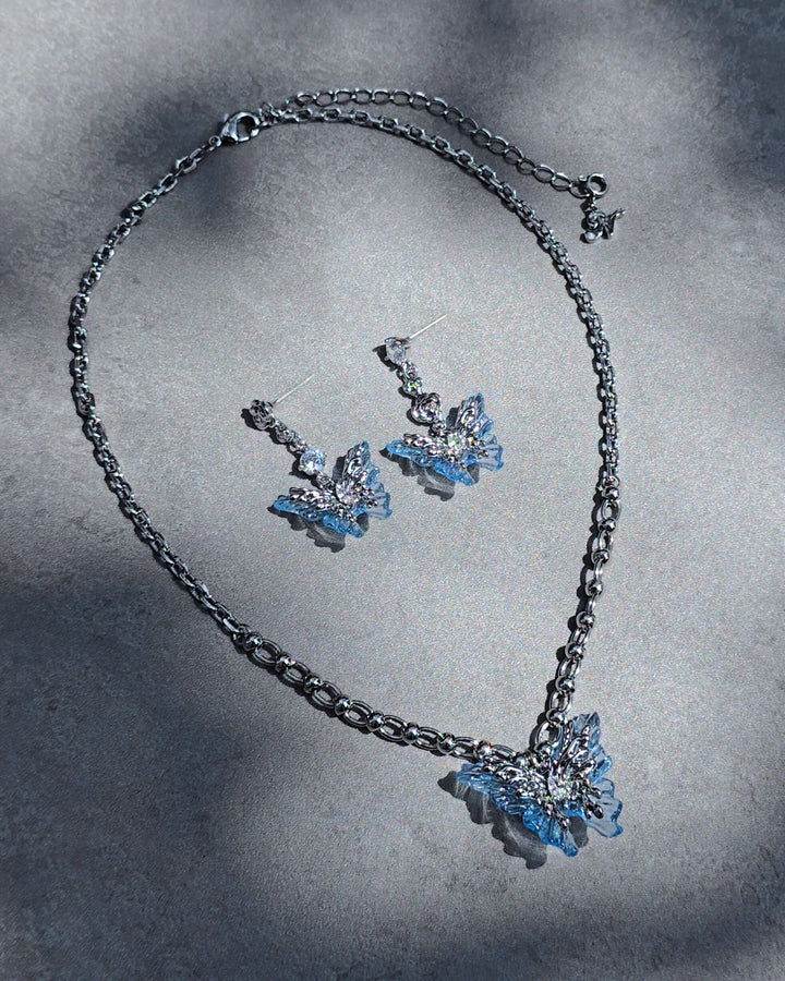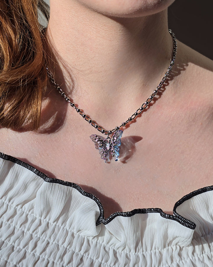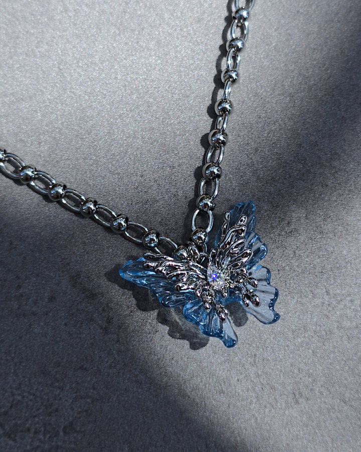Silver chain necklace with a transculent blue butterfly pendant, detailed in shimmering silver and finished with a sparkling gemstone.