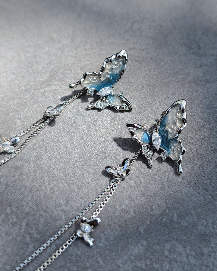 Silver butterfly earrings with dangling chains, adorned with zirconia. Blue and white toned wings resemble the colors of a glacier.