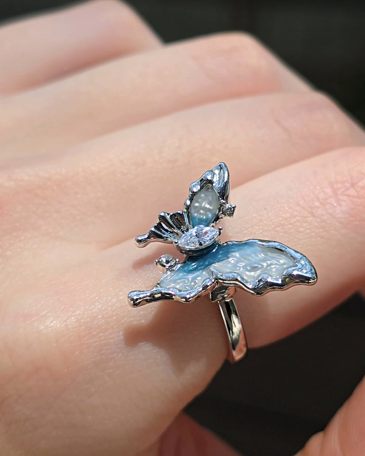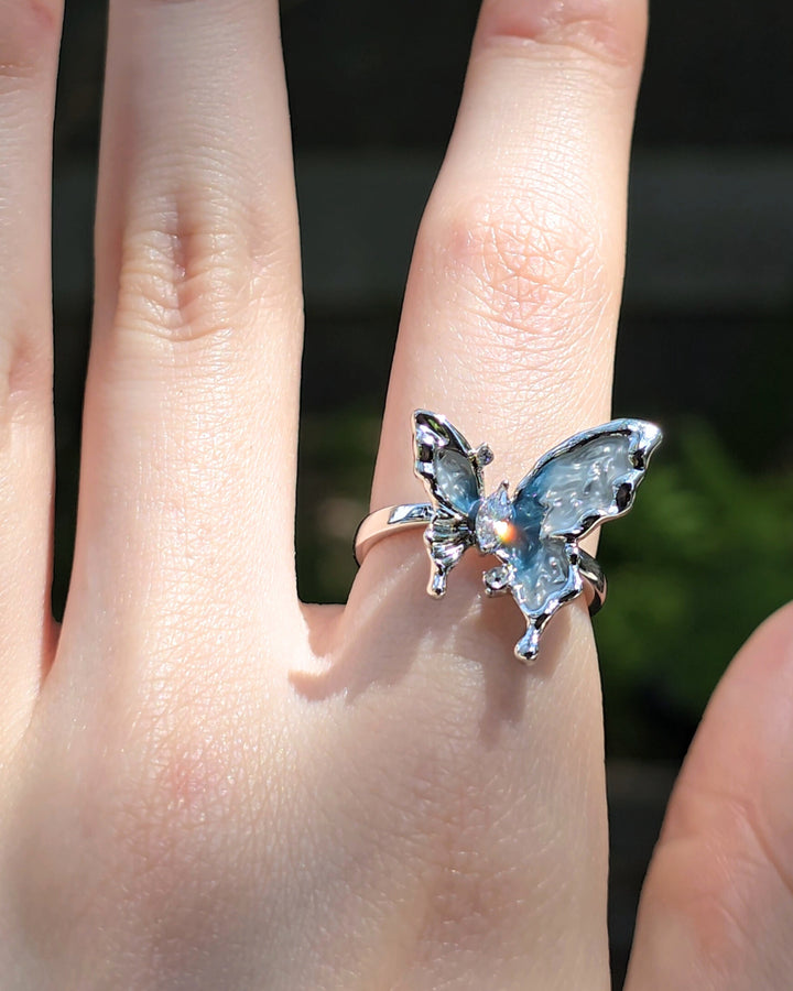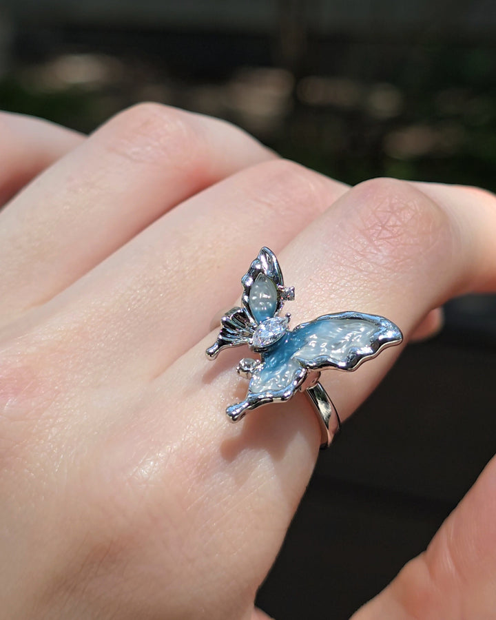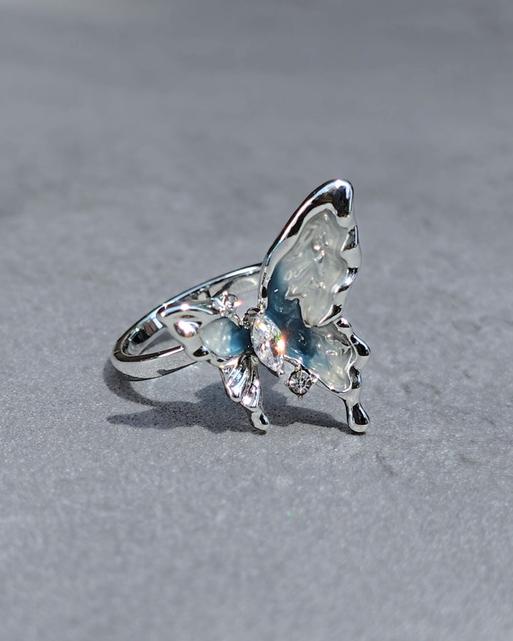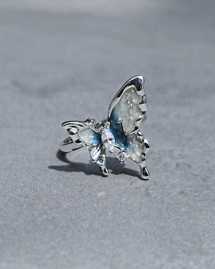 Silver butterfly ring adorned with zirconia, its blue and white toned wing reflecting the cool shades of a glacier.