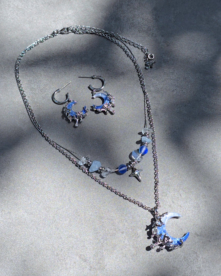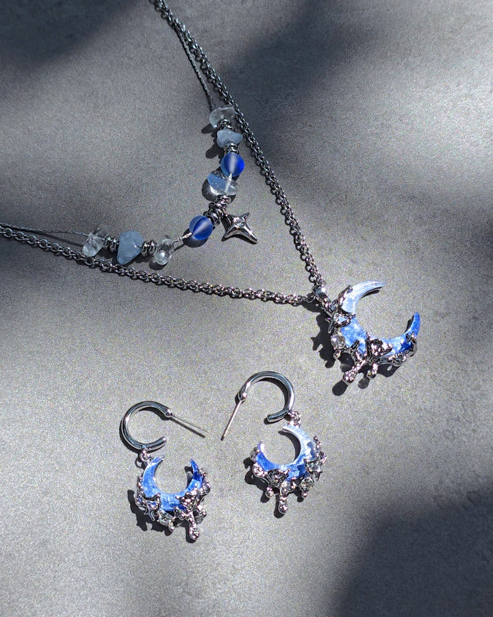Earrings feature a shimmering blue crescent moon design with sparkling crystal details for celestial touch.