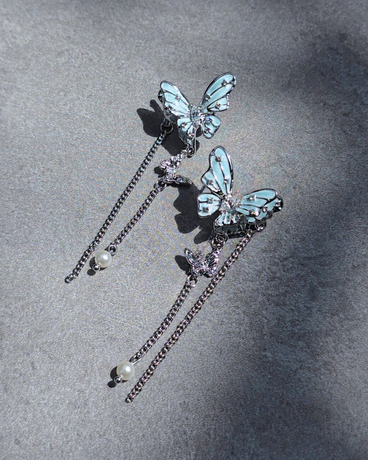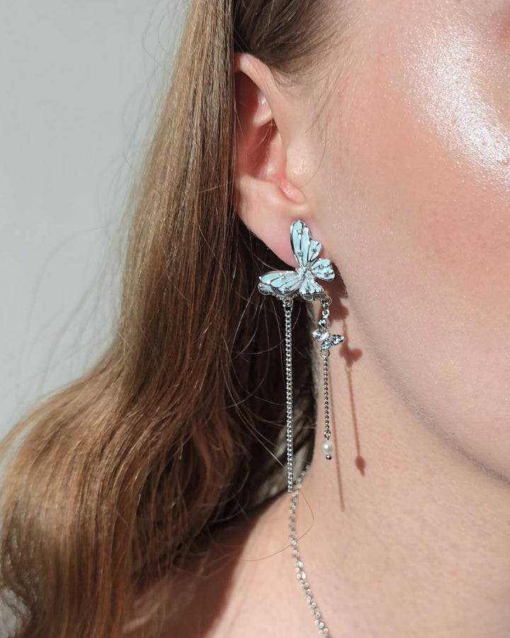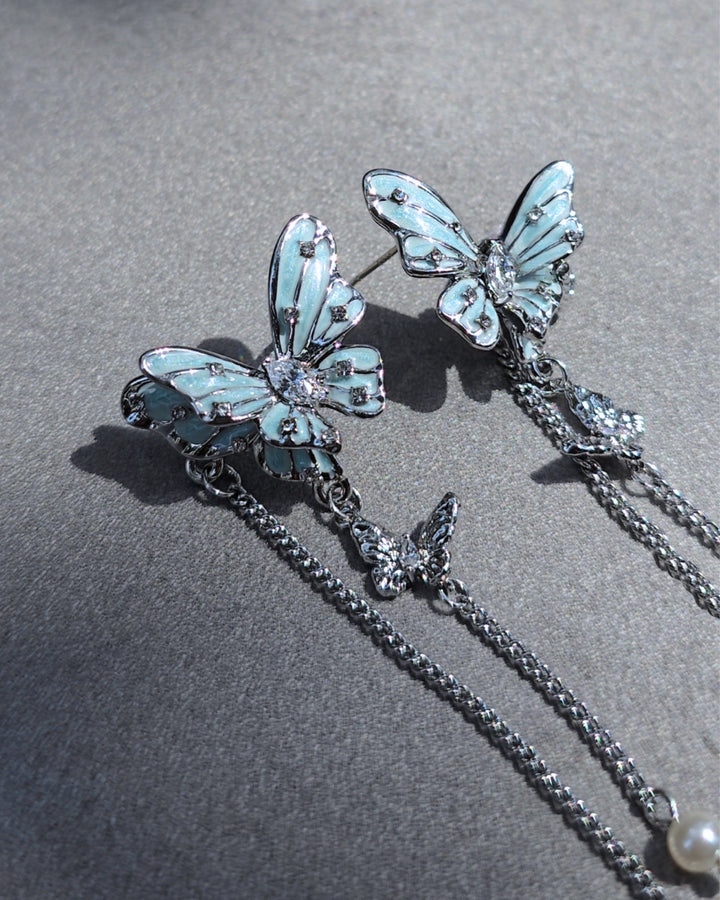 Silver earrings with delicate blue butterflies, accented by gemstones and fine dangling chains. Their wings are sprinkled with tiny crystals that glisten like dewdrops.